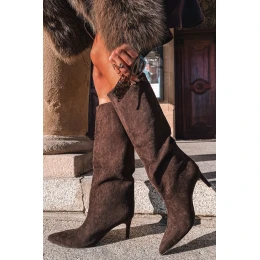 Dámské kozačky z eko semiše nazouvací na podpatku čokoládové Phelin