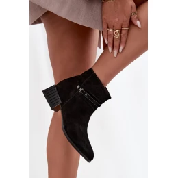 Elegantní dámské semišové kotníkové boty představují spojení elegance a pohodlí. Model na stabilním kockovém podpatku zajišťuje pohodlí při nošení a vyhřívané vnitřní prostředí je ideální na chladnější dny. Boty se zapínají na zip, což usnadňuje obouvání. Dodává jim kouzlo ozdobný pásek a prošití vedoucí po celé délce přední části límce, které zdůrazňují jejich stylový, ženský charakter. Ideální volba pro ženy, které oceňují eleganci v každodenním životě – vhodné do práce, na schůzky a na běžné nošení. Při výběru velikosti se řiďte tabulkou velikostí. Při výběru velikosti se řiďte tabulkou velikostí.