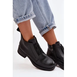 Dámské kožené kotníkové boty na podpatku s ozdobou D&A – černé