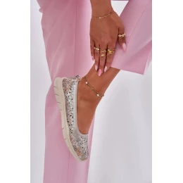 Zlaté baleríny Leaneila doporučujeme kombinovat s neutrálními nebo pastelovými outfity, aby jemný lesk boty vynikl jako hlavní doplněk.