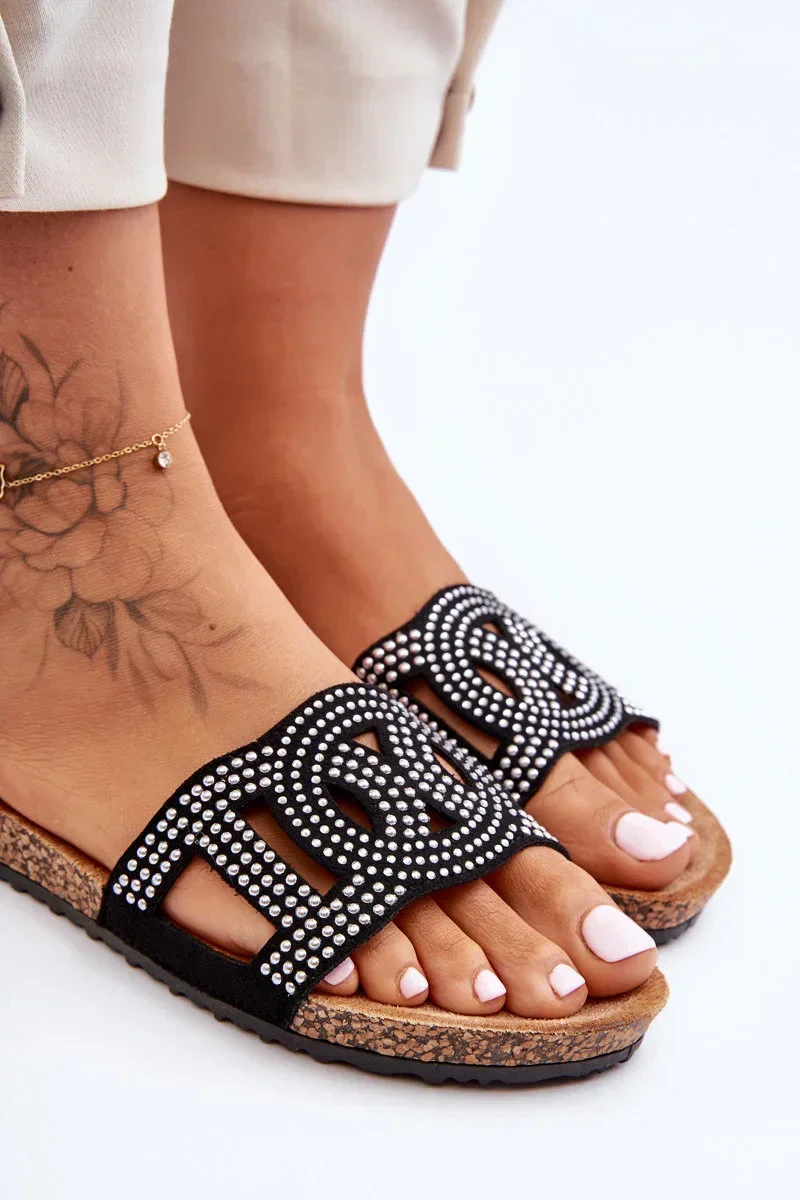 Klasické ženské sandály byly vyrobeny z měkkého eko semiše a ozdobeny moderními kovovými čepičkami na přední straně. Sandály jsou ideální na letní procházky nebo nákupy. Profilovaná vložka také byla vyrobena z eko semiše. Sandály jsou osazeny na korkové podrážce.