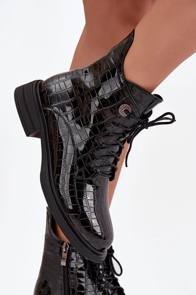 Dámské lakované kožené kotníkové boty s embossingem a zateplením Juviane – černé