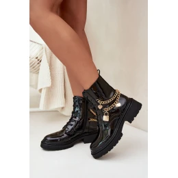 Stylové dámské boty typu workery z eko kůže jsou ideální volbou pro chladnější dny. Ozdobené zlatým řetízkem se závěsky, které dodávají módní akcent a jedinečný vzhled.