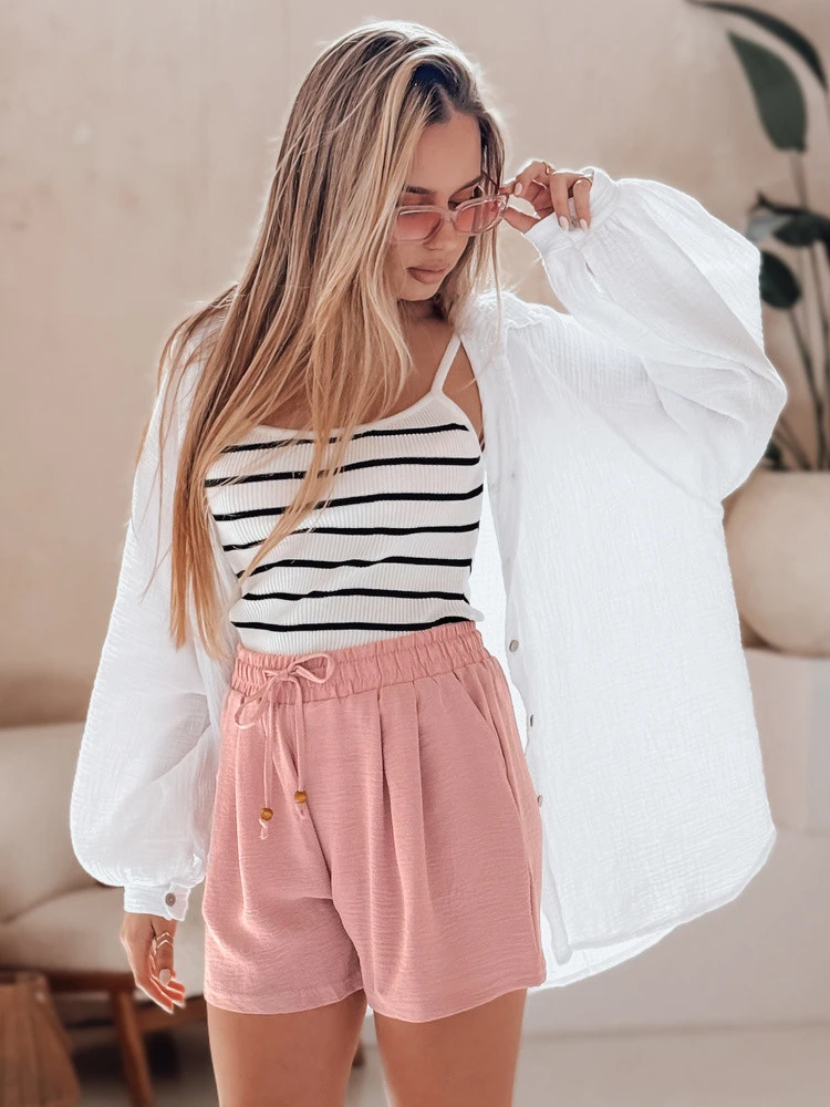 Dámské látkové šortky s vysokým pasem jsou ideální volbou pro teplé letní dny. Jsou vyrobeny z lehkého a na dotek příjemného materiálu a zaručují pohodlné nošení i v horkém počasí. Elastický pas a dodatečné vázání umožňují dokonalé přizpůsobení a dvě ozdobné kapsy na přední straně dodávají šmrnc. Skvěle se hodí pro každodenní styling i během letních procházek a výletů.