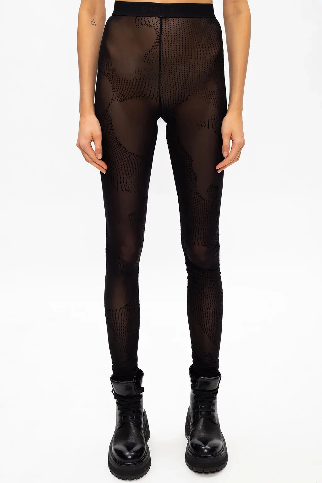 Černé legíny značky Diesel. Tento pár je vyroben z poloprůhledné strečové síťoviny a má elastický pas a sametový geometrický motiv.
