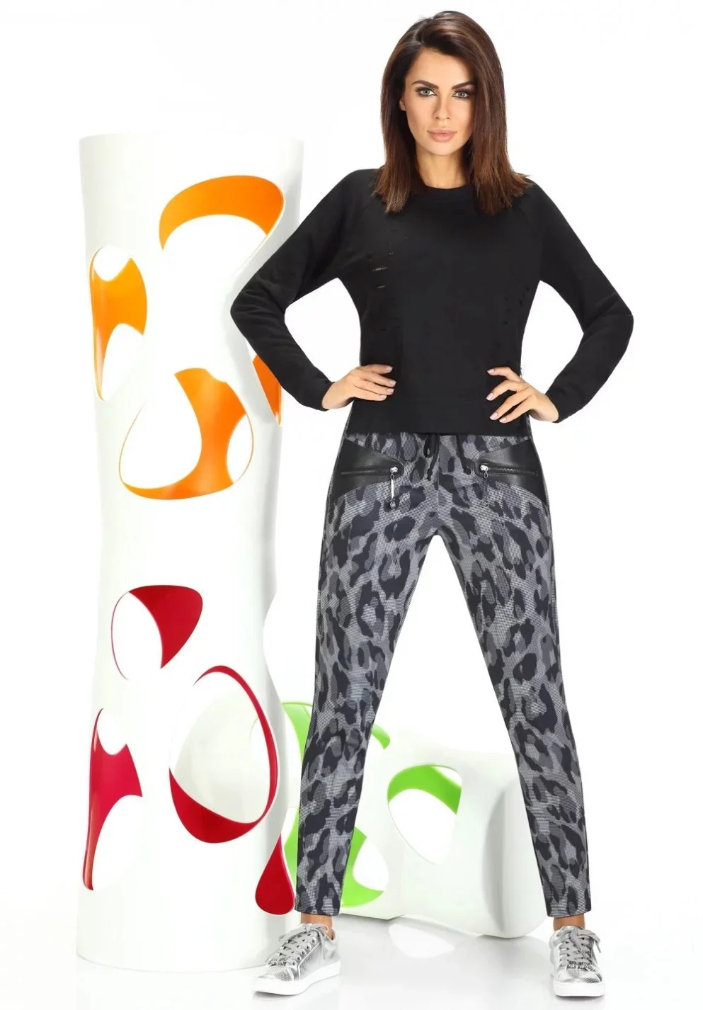 Jsou z příjemného elastického materiálu, krásně modelují postavu, v módním maskáčovém designu. Barva černo-šedá.