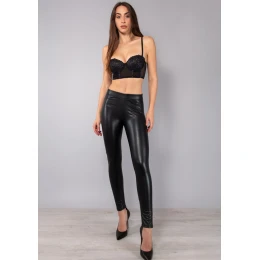 Dámské legíny Siélei v černé barvě s lesklým efektem působí moderně a elegantně. Jsou vyrobené z imitace kůže s povrchovou úpravou z polyuretanu, která se krásně přizpůsobí postavě a zvýrazní její tvary. Vnitřní strana je podšitá příjemnou látkou, která zvyšuje komfort při nošení a brání nepříjemnému lepení na kůži. Legíny mají hladký pas bez zapínání a díky elastickému provedení se snadno oblékají. Skvěle se kombinují s košilí, svetrem nebo sakem pro stylový každodenní outfit.