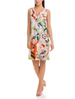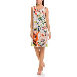 Letní dámské šaty s barevným potiskem květin na béžovém základu, vyrobené z vysoce kvalitního materiálu a navržené podle nejnovějších trendů.