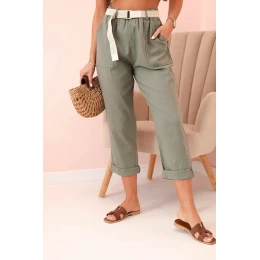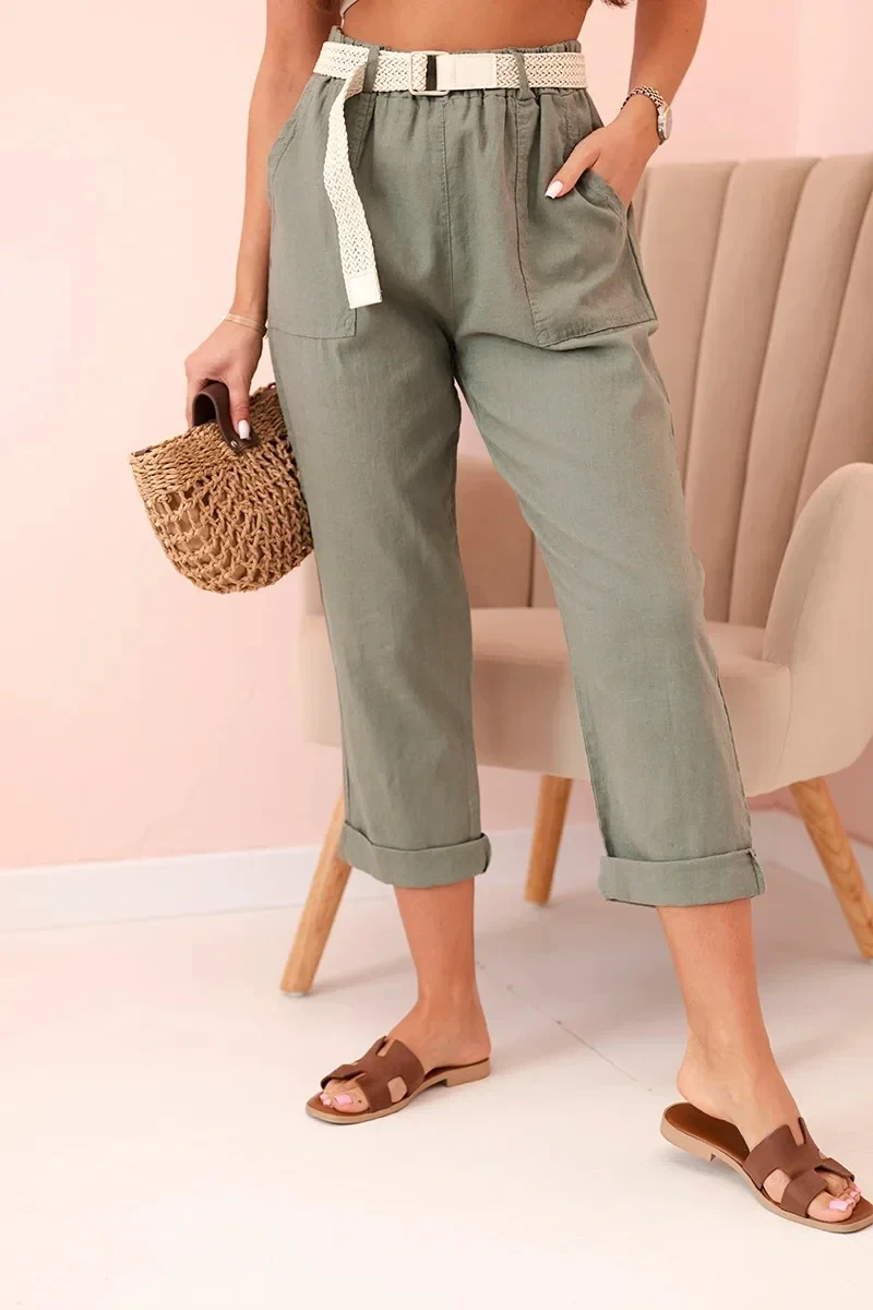 Dámské lněné kalhoty s bavlnou a páskem khaki