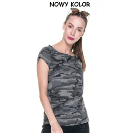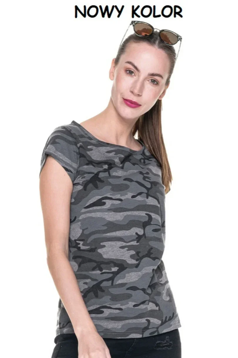 Dámské tričko ušité z hladkého materiálu single jersey s tištěným maskáčovým vzorem. Tričko má dvojté švy a pevné lem. Gramáž: 170g/m2. Složení: 100% poločesaná bavlna.