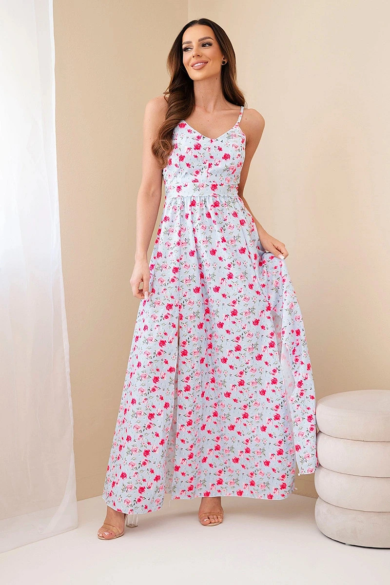 Nádherné dámské maxi šaty s romantickým charakterem jsou ideální volbou na léto, dovolenou i výjimečné příležitosti. Model na tenkých ramínkách krásně zvýrazňuje ramena a dekolt, přiléhavý vršek zdůrazňuje postavu a zajišťuje ženský a elegantní vzhled. Jemný květinový vzor dodává celému outfitu lehkost a svěžest.