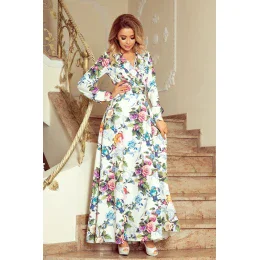 Dámské maxi šaty s volánkem, výstřihem a se vzorem barevných růží a světle modrých ptáčků model 7404387