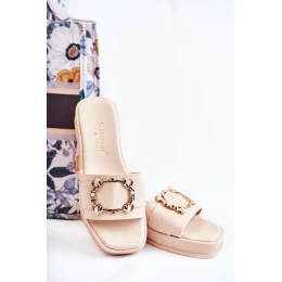 Elegantní dámské pantofle s otevřenou špičkou a hranatou přední částí – nejmódnější střih této sezóny! Pantofle mají měkkou vložku z eko kůže. Pásek zdobený řetízkem. Plochá podrážka s platformou je vyrobena z plastu. Tyto pantofle doplní nejednu letní stylizaci! Určitě si prohlédněte celou naši kolekci dámských pantoflí. Při výběru velikosti použijte tabulku velikostí.