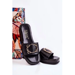 Elegantní dámské pantofle s otevřenou špičkou a hranatou přední částí – nejmódnější střih této sezóny! Pantofle mají měkkou vložku z eko kůže. Pásek zdobený řetízkem. Plochá podrážka s platformou je vyrobena z plastu. Tyto pantofle doplní nejednu letní stylizaci! Určitě si prohlédněte celou naši kolekci dámských pantoflí. Při výběru velikosti použijte tabulku velikostí.