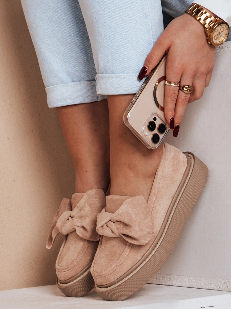 Dámské mokasíny na silné platformě, vyrobené ze semišové ekokůže a stélky z ekokůže, s mašlí na špičce, univerzální obuv, která obohatí každý outfit, od ležérního po elegantní.