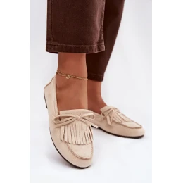Ploché dámské mokasíny vyrobené z eko semiše jsou stylovou a pohodlnou volbou na každý den. Vepředu jsou dekorativní třásně a zavázání ve tvaru mašle. Měkký materiál zajišťuje pohodlí při nošení a plochá podrážka činí tento model ideálním pro každodenní použití. Mokasíny skvěle doplní jak klasické, tak i volnější stylizace. Při výběru velikosti se řiďte tabulkou velikostí.