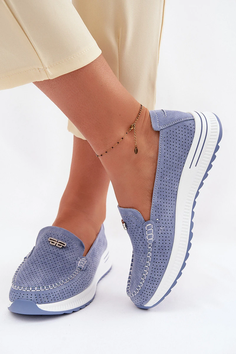 Dámské mokasíny z přírodního semiše jsou stylovou a velmi pohodlnou volbou pro každý den. Lehká a velmi pohodlná, skvěle se přizpůsobují noze a zajišťují pohodlí i při dlouhodobém nošení. Svršek s jemnými perforacemi zvyšuje prodyšnost a dodává obuvi lehkost a moderní vzhled. Kožená vložka typu Comfort Shoes se stará o správnou oporu a pohodlí při každém kroku. Na přední straně je jemný dekorativní prvek ozdobený lesklými cyrkoniemi, který dodává celku eleganci a ženský šarm. Ideální volba pro ženy, které ocení spojení pohodlí, kvality a módního vzhledu. Při výběru velikosti se řiďte tabulkou velikostí.