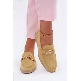 Dámské mokasíny vyrobené z příjemného na dotek eko semiše jsou skvělou volbou na každý den. Plochý střih zajišťuje pohodlí po celý den a stylový pásek se zlatou přezkou jim dodává elegantní vzhled. Vnitřek boty je vybaven měkkou vložkou z eko kůže, která zvyšuje komfort nošení. Ideální pro casual i více klasické outfity. Při výběru velikosti se řiďte tabulkou velikostí.