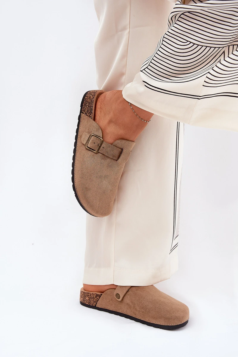 Dámské pantofle na korkové platformě. Vyrobené z eko semiše. Zakryté špičky poskytují větší ochranu a přezka umožňuje dokonalé přizpůsobení noze. Profilovaná stélka zaručuje pohodlí po celý den a poskytuje správnou oporu. Tyto pantofle budou vynikající volbou na každodenní nošení, ideální pro casual stylizace, poskytující pohodlí a módní vzhled. Při výběru velikosti se řiďte tabulkou velikostí.