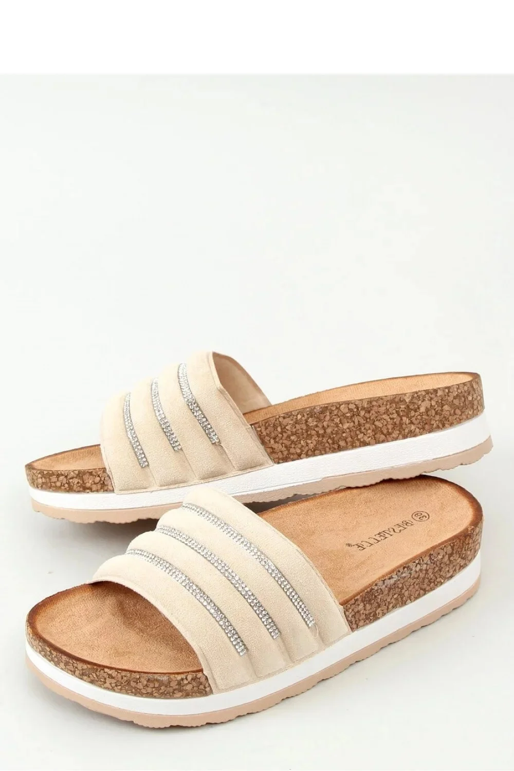 Dámské semišové žabky na korku. Model na vysoké podrážce (4 cm) dokonale odpovídá trendům této sezóny. Široký semišový pásek zdobený zirkony dokonale drží nohu. Jsme přesvědčeni, že tyto žabky s profilovanou vnitřní stélkou splní vaše očekávání: ) Vnější materiál - ekologický semiš.