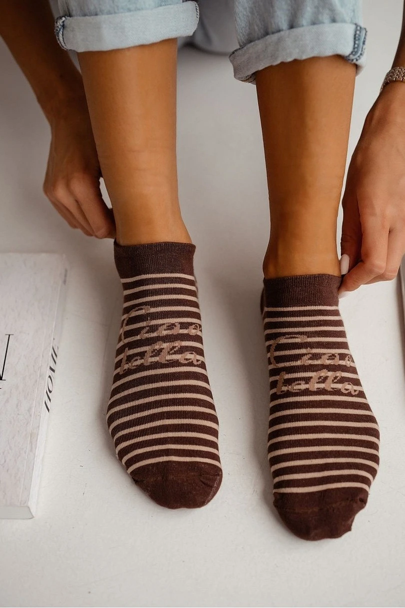 Bavlněné vzorované dámské ponožky jsou dokonalou kombinací pohodlí a stylu pro každodenní nošení. Jsou vyrobeny z vysoce kvalitní bavlny a poskytují vynikající prodyšnost a pohodlí po celý den. Díky elastickému materiálu dokonale přiléhají k noze a při chůzi netlačí ani nekloužou. Roztomilý pruhovaný vzor s nápisem "Ciao Bella" jim dodává módní, ženský charakter a činí z nich skvělý doplněk každodenního oblečení. Jsou ideální volbou pro ženy, které ocení pohodlí a styl v jednom.