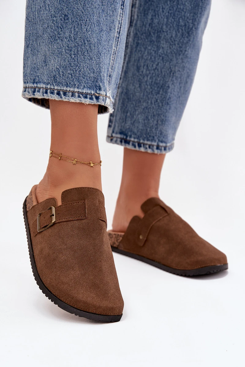 Dámské pantofle na korkové platformě. Vyrobené z eko semiše. Zakryté špičky poskytují větší ochranu a přezka umožňuje dokonalé přizpůsobení noze. Profilovaná stélka zaručuje pohodlí po celý den a poskytuje správnou oporu. Tyto pantofle budou vynikající volbou na každodenní nošení, ideální pro casual stylizace, poskytující pohodlí a módní vzhled. Při výběru velikosti se řiďte tabulkou velikostí.