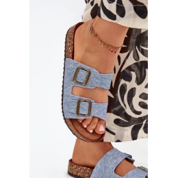 Dámské pantofle na korkové platformě s přezkami – světlý denim