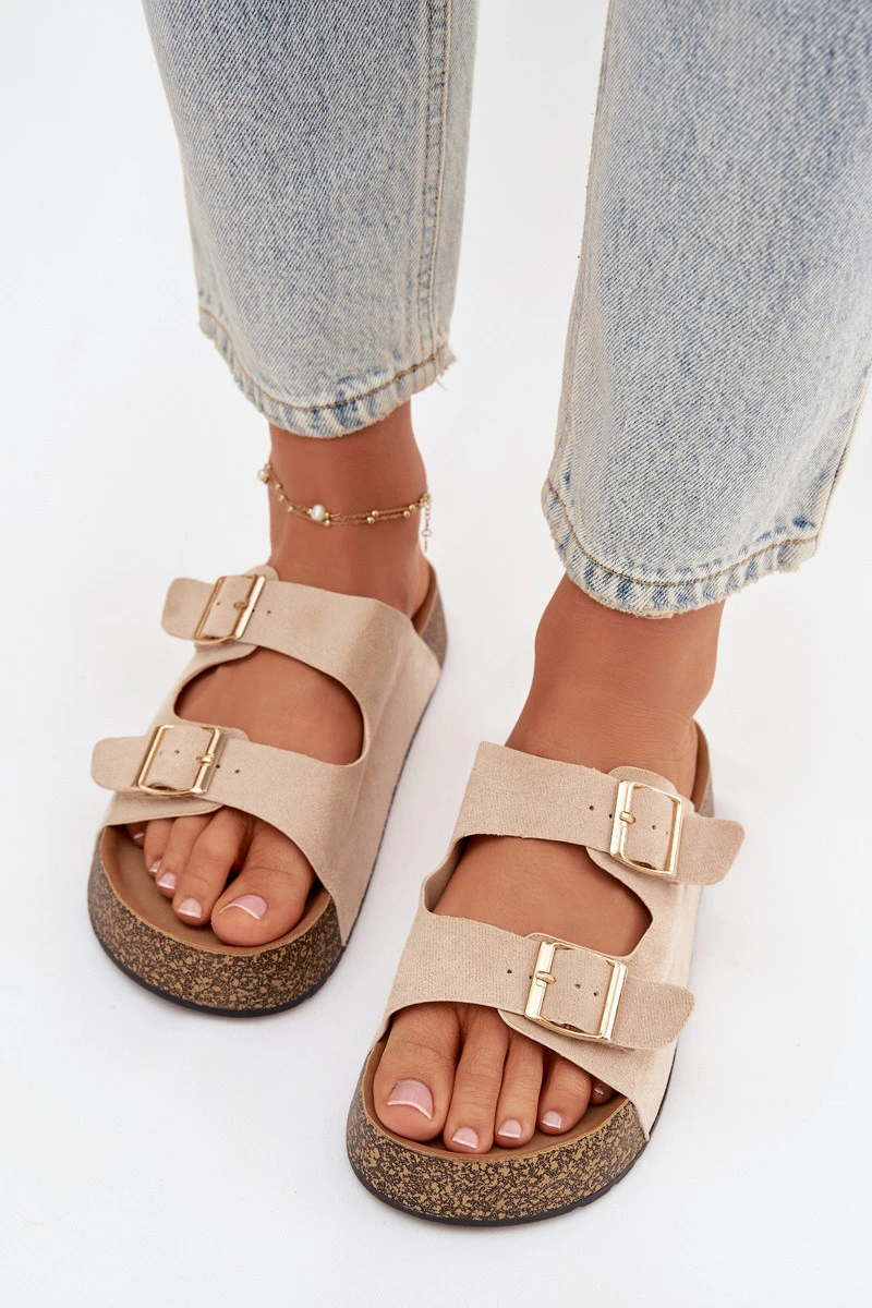 Dámské pantofle na korkové platformě jsou módní a pohodlnou volbou na teplé dny. Vyrobené z eko semiše, vypadají stylově a příjemně se přizpůsobují noze. Dva pásky se zlatými přezkami dodávají celku elegantní charakter a zdůrazňují aktuální trendy. Model se skvěle hodí do letních stylizací, spojující pohodlí s módním vzhledem. Při výběru velikosti se řiďte tabulkou velikostí.
