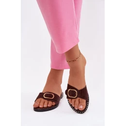 Dámské pantofle na ploché podrážce se zlatou sponou čokoládové Selivelle