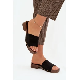 Dámské pantofle vyrobené z eko semiše jsou stylovou a pohodlnou volbou na každý den. Ploché podpatky zajišťují komfort při nošení a volnost při chůzi. Pás s ozdobnými zlatými nýty dodává celku módní a lehce elegantní charakter. Model se skvěle hodí do letních stylizací. Při výběru velikosti se řiďte tabulkou velikostí.