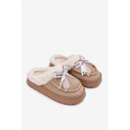 Vnitřní zateplení hebkým kožíškem obepíná nohy teplem, což je ideální pro chladnější dny. Roztomilá mašle s nápisy vpředu dodává pantoflím dívčí půvab a odlišuje je od klasických modelů.