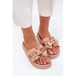 Dámské pantofle s výřezy, usazené na jemné platformě. Vyrobeny z eko gumového materiálu. Ozdobené mašlí a zlatou broží, dodávají stylový akcent každému outfitu. Ideální na teplé dny, skvěle se hodí k letním šatům, sukním a šortkám. Při výběru velikosti se řiďte tabulkou velikostí.