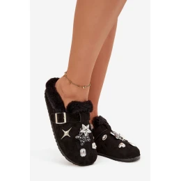 Dámské pantofle s ozdobami a sponou, zateplené kožíškem – černé Thalora