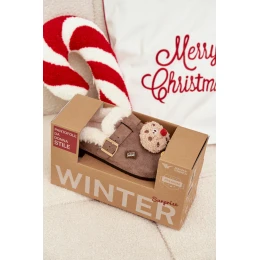 Dámské pantofle s ozdobami a sponou, zateplené kožíškem – hnědé Thalora