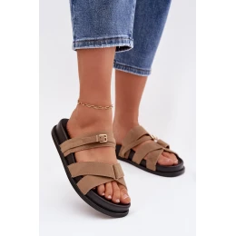 Dámské pantofle s pásky a zlatým přezkou tmavě béžové Selorina