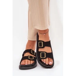 Stylové pantofle vyrobené z eko zamše. Umístěné na platformě, která spojuje pohodlí s módním vzhledem. Pásky s přezkami zajišťují dokonalé přizpůsobení a profilovaná stélka zaručuje komfort po celý den. Tyto pantofle budou skvělou volbou na letní dny, hodící se jak k šatům, tak k kalhotám. Při výběru velikosti se řiďte tabulkou velikostí.
