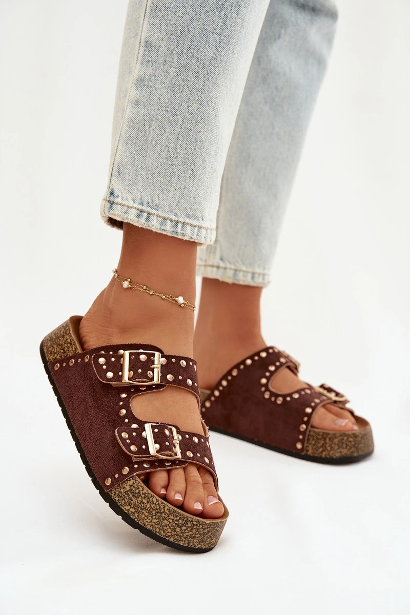 Dámské pantofle s zlatými sponami a knoflíky hnědé Tervina