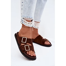 Dámské pantofle z imitace semiše s zlatými přezkami čokoládové Selissea