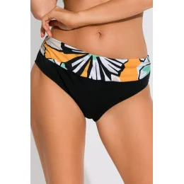 Koupací kalhotky klasického střihu, řasení v horní části ze vzorovaného mikrovlákna, spodní a zadní část z hladkého černého materiálu.