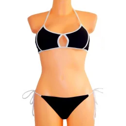Dámské dvoudílné bikiny, plavky v elegantním černobílém provedení, podprsenka je černá, zdobená bílým lemem. Kalhotky jsou černé, vyjma zavazovacích tkanic. Podprsenka je vybavena vyjímatelným polstrováním a je vybavena tkanicí, kterou se plavky zavazují za krkem. Kalhotky jsou zavazovací tkanicí na bocích.