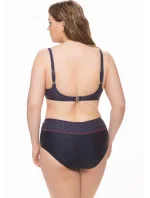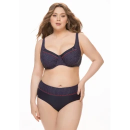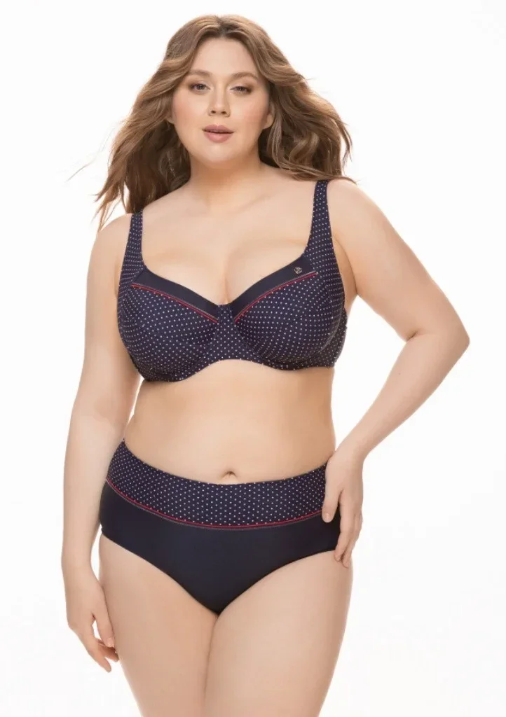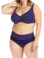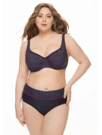 Dámské dvoudílné plavky značky FANTASY. Horní díl tvoří podprsenka klasického střihu s vyšším středem. Košíčky s kosticemi nejsou vyztužené. Jsou ušity tak, aby podržely a pozvedly i větší ňadra. Ramínka jsou pevně všitá a nastavitelná. Obvod je vyšší, v bocích vyztužen ohebnými silikonovými kosticemi, aby podprsenka správně držela na místě. Celý obvod je lemován pružnou gumičkou. Zapínání se nachází v zadní části ve formě kovové spony. Spodní díl tvoří kalhotky v klasickém střihu s vyšším pasem. V nohavičkách je našita pružná gumička. Horní i spodní díl jsou celé podšity.