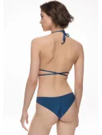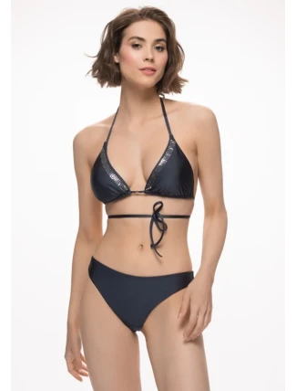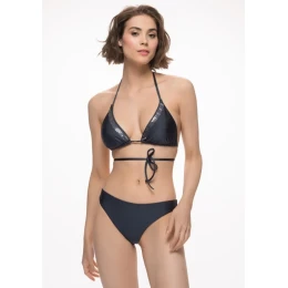 Dámské dvoudílné plavky FANTASY. Horní díl tvoří podprsenka s trojúhelníkovými košíčky. Košíčky jsou jemně vyztuženy a výztuhy jsou vyjímatelné. Na vniřním okraji je potisk leslé barvy ve tvaru řeckého ornamentu. Spodní částí košíčků je protažena šňůrka, která má zároveň funkci obvodu se zavazováním na zádech. Mezi košíčky je ozdobný stříbrný korálek. Ramínka tvoří šňůrka všitá do horního košíčku se zavazováním za krkem. Kalhotky jsou jednoduché, hladké, v brazilkovém střihu. V pase a přední části nohaviček je našitá pružná gumička.