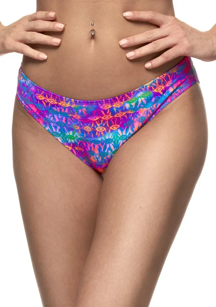 Dámske plavky FANTASY kolekce Amy. Kalhotky klasického střihu mají nižší pas a vpředu jsou lehce vykrojeny. Plavky jsou pestrobarevné, hladké. V pase a nohavičkách je našitá pružná gumička. Celý díl je podšitý rychleschnocí látkou. Ke kalhotkám lze kombinovat jakýkoliv horní díl ze stejné kolekce.