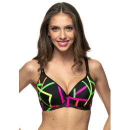 Dámské plavky Fantasy z nové kolekce Neon. Dámský horní plavkový díl v zářivém barevném provedení má jemně vyztužené nařasené košíčky s kosticemi a nižší střed. Plavky lemuje úzký proužek v černé barvě. Střih košíčků a středně široký obvod podprsenky s bočními pružnými kosticemi Vám zaručí pevné a pohodlné nošení. Podprsenka má nastavitelná ramínka, která lze jednoduše zapnout, nebo uvázat za krk. Zadní zapínání je ukončeno pevně všitou sponou na záháknutí. Plavky jsou české výroby a koupí tohoto výrobku podpoříte produkci českého oděvního průmyslu.