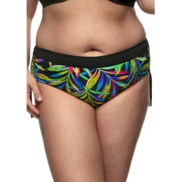 Dámské plavky české značky FANTASY z kolekce Tropic. Kalhotky klasického střihu s vyšším pasem jsou celé podšity. Pas lemuje ozdobný černý pruh. V bocích jsou všity ozdobné šňůrky, kterými lze částečně korigovat výšku kalhotek a řasení. V pase i nohavičkách jsou našity pružné gumičky. Ke kalhotkám lze kombinovat jakoukoliv podprsenku ze stejné kolekce.