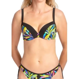 Dámske plavky FANTASY z kolekce Tropic. Plavková podprsenka s mírným push up efektem má vyztužené košíčky s kosticemi a nižší střed. Na bocích jsou košíčky lehce nařaseny, z vnější strany jsou košíčky lemovány černou látkou a mezi košíčky je ozdobný látkový proužek. Vpředu jsou ramínka pevně všitá, vzadu na háček - dají se tak nosit i překříženě. Pružný obvod je v bocích vyztužen flexibilní silikonovou kosticí, aby podprsenka držela na místě. Zapínání na zádech je řešeno kovovou sponou. Celé plavky jsou podšity. Horní a spodní díl z jedné kolekce lze libovlně kombinovat.