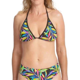 Dámské plavky značky FANTASY - horní díl. Podprsenka má trojúhelníkové košíčky bez kostic s vyjímatelnou lehkou výztuhou. Ramínka jsou součástí vnějšího lemu košíčků a jsou na zavazování za krkem. Obvod je tvořen šňůrkou, která je provlečena spodní částí košíčků. Zavazuje se na zádech, lze díky němu regulovat vzdálenost košičků i délku obvodu. K podprsence lze kombinovat jakékoliv kalhotky ze stejné kolekce.