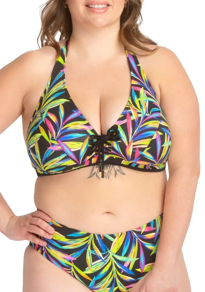 Dámské plavky Fantasy z kolekce Tropic. Dámský horní plavkový díl má bezkosticové vyztužené košíčky s vyjímatelnými výztuhami. Košíčky mají trojúhelníkový tvar, pomocí tkaničky můžete regulovat vzdálenost košíčků od sebe. Ramínka jsou součástí košíčků a přechází do mašličky na vázání za krkem. Obvod podprsenky je v bocích vyztužen flexibilními silikonovými kosticemi, které se Vám přizpůsobí, spodní část obvodu je spevněna. Zapínání je umístěno v zadní části obvodu na kovovou sponu. U těchto plavek lze libovolně kombinovat spodní a horní díl v dané kolekci.