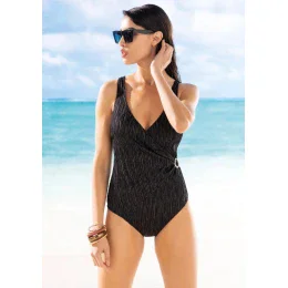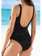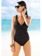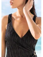 Jednodílné dámské plavky od italské značky Siélei. Plavky mají všitou jemnou podprsenkovou výztuž, která má ve spodní části pružnou gumu. Ramínka mají pevně všitá, nejsou délkově nastavitelná. Vzadu mají hlubší výstřih. Vpředu mají částečné přeložení zužující se směrem do boku s kruhovou aplikací v nejužším místě, plavky tak vizuálně zeštíhlí postavu. Tomu dopomůžou také zlaté svislé proužky a svislé řasení látky. Celé plavky jsou podšity.