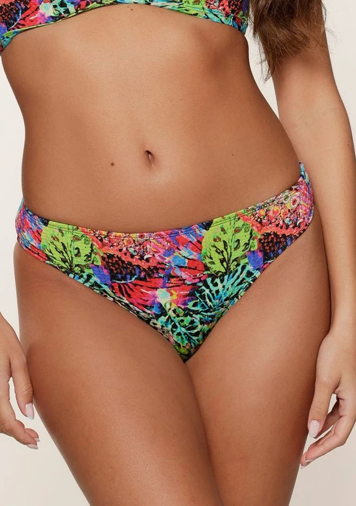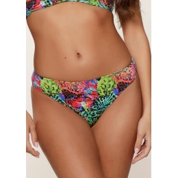 Spodní díl plavek LingaDore ve veselém tropickém vzoru zaujme na první pohled. Klasický střih s pohodlně vyšším pasem krásně padne, zvýrazní siluetu a poskytne příjemné krytí. Díky kvalitnímu recyklovanému materiálu s příměsí elastanu skvěle sedí a drží tvar i při celodenním nošení.